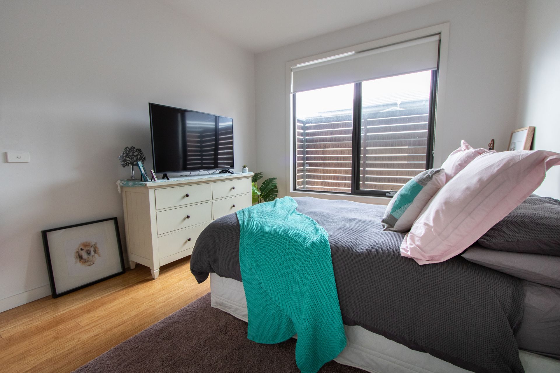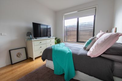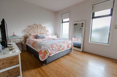 Downstairs features open plan gourmet kitchen/living area flowing through bi-fold doors to generous entertaining deck and compact garden, perfect for entertaining. Quality Smeg appliances, gas cooktop, dishwasher and Caesarstone benchtops ensure all aspiring chefs will experience happiness in the kitchen!